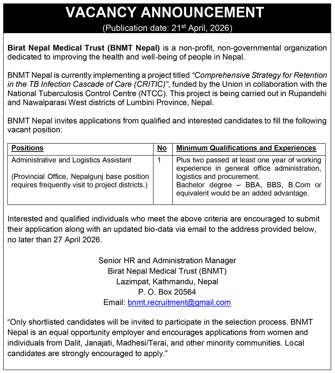 Birat Nepal Medical Trust (BNMT Nepal) is a Nepalese non-governmental organisation dedicated towards the improved health and well-being of Nepalese people. BNMT Nepal envisions a new Nepal where all Nepalese are aware of their basic rights and are able to live healthy and productive lives, in a safe environment without having to worry about food, income or security regardless of their gender, ethnicity, disability or HIV status.